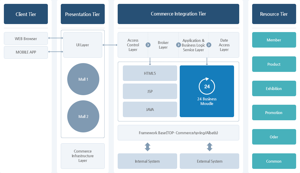 Top-Commerce SolutionÀº Client/Presentation/Commerce Integration/Resource 4°³ÀÇ ¿µ¿ªÀ¸·Î ±¸¼ºµÇ¾î ÀÖ½À´Ï´Ù.